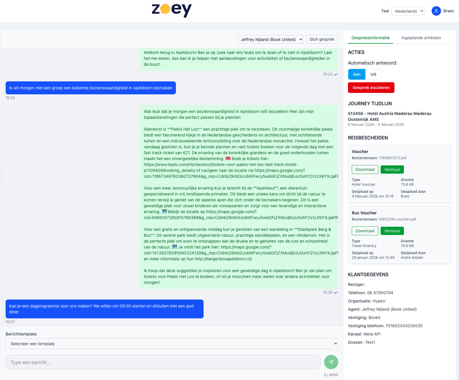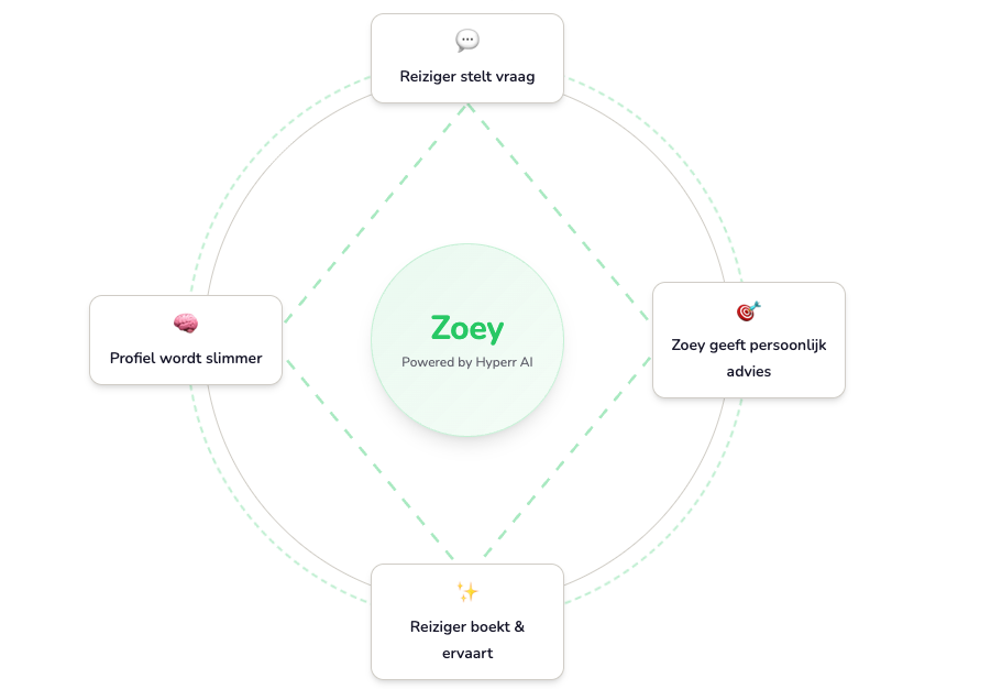 Zoey verandert dat. Als whitelabel AI travel concierge begeleidt Zoey jouw reizigers via WhatsApp: van restauranttips en bezienswaardigheden tot activiteiten en tickets. Onder jóuw merknaam, gekoppeld aan jóuw aanbod.
